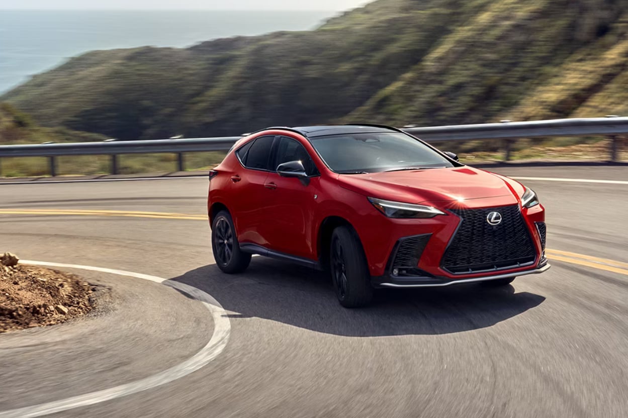 The NX lineup typically includes NX 350, NX 350h (hybrid), and NX 450h+ (plug-in hybrid) with available Premium, Luxury, and F SPORT Handling trims.